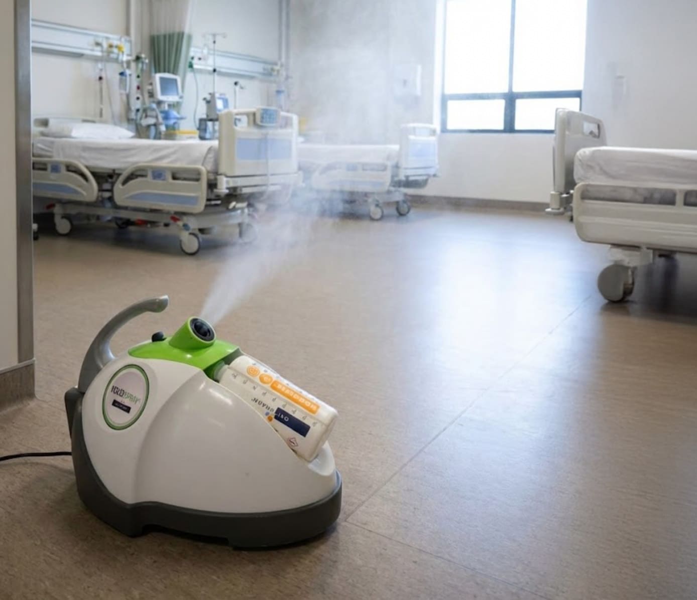 Dry hydrogen peroxide vapour delivered via programmed protocols. The system controls concentration, contact time, and coverage automatically. Outcomes are validated through biological indicators and environmental monitoring.